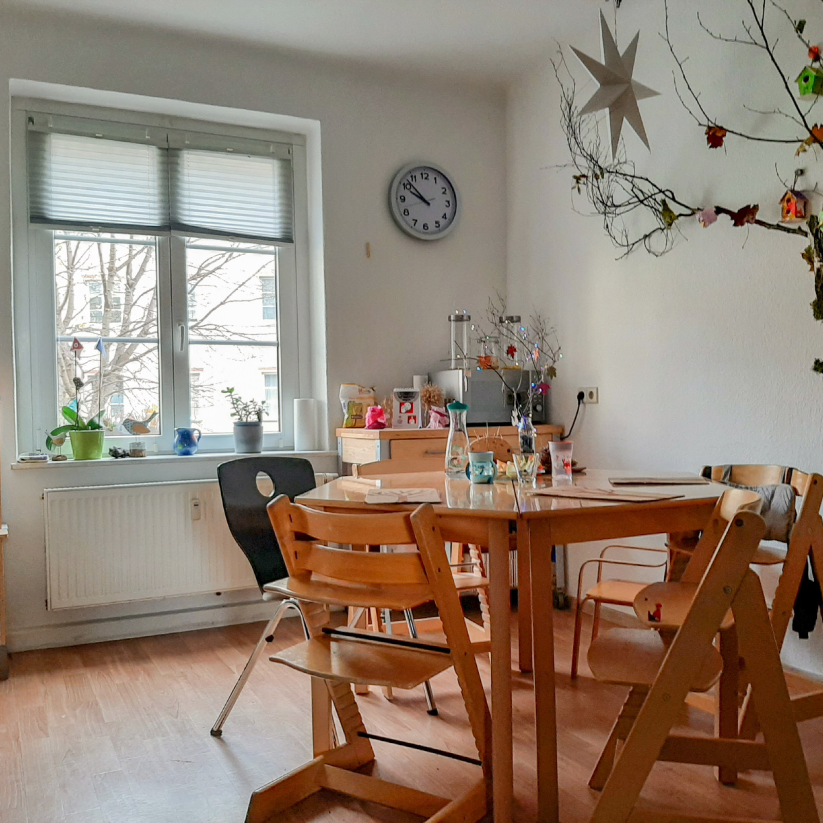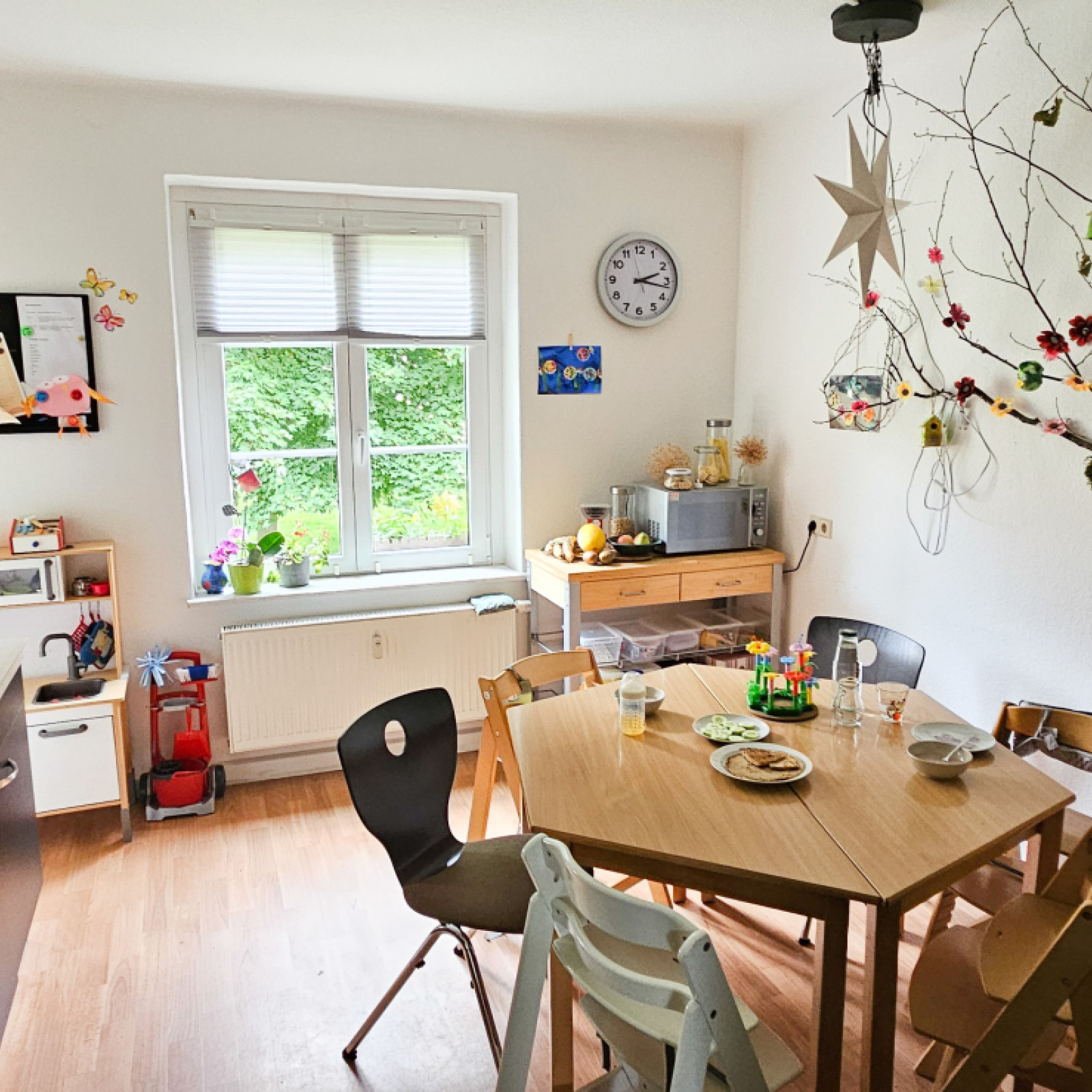 Ein großer Ess-, Bastel- und Maltisch hat in unserer Küche Platz, sodass wir unsere Mahlzeiten zusammen vorbereiten und einnehmen können. Sehr wichtig sind uns die gesunde Ernährung und frisches, selbst gekochtes Essen, wobei die Kinder mit einbezogen werden.