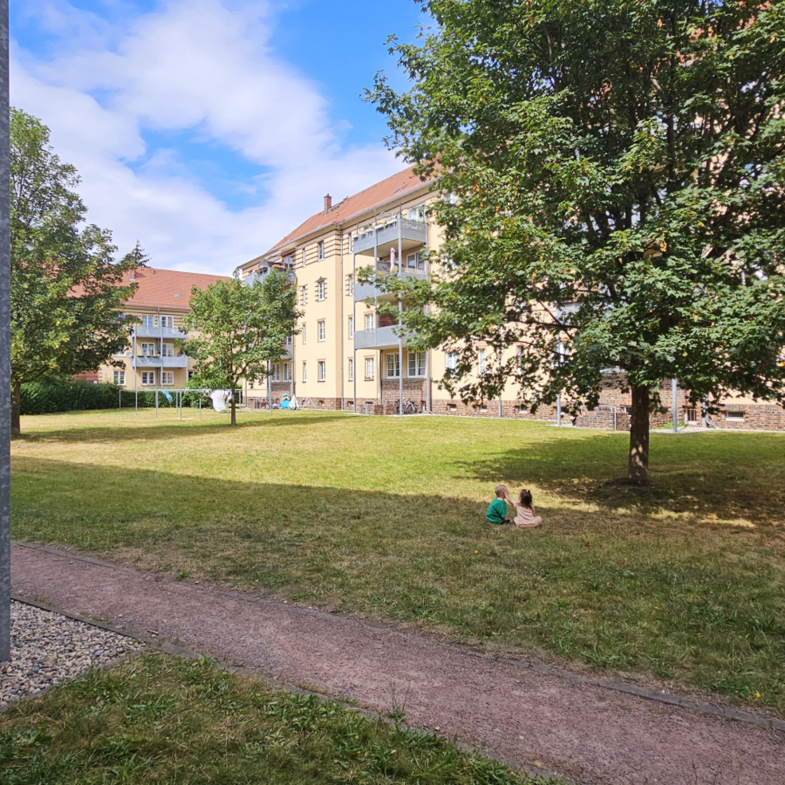 In der näheren Umgebung stehen uns Spielplätze zur Verfügung, so auch ein großes, im Boden eingelassenes Trampolin.