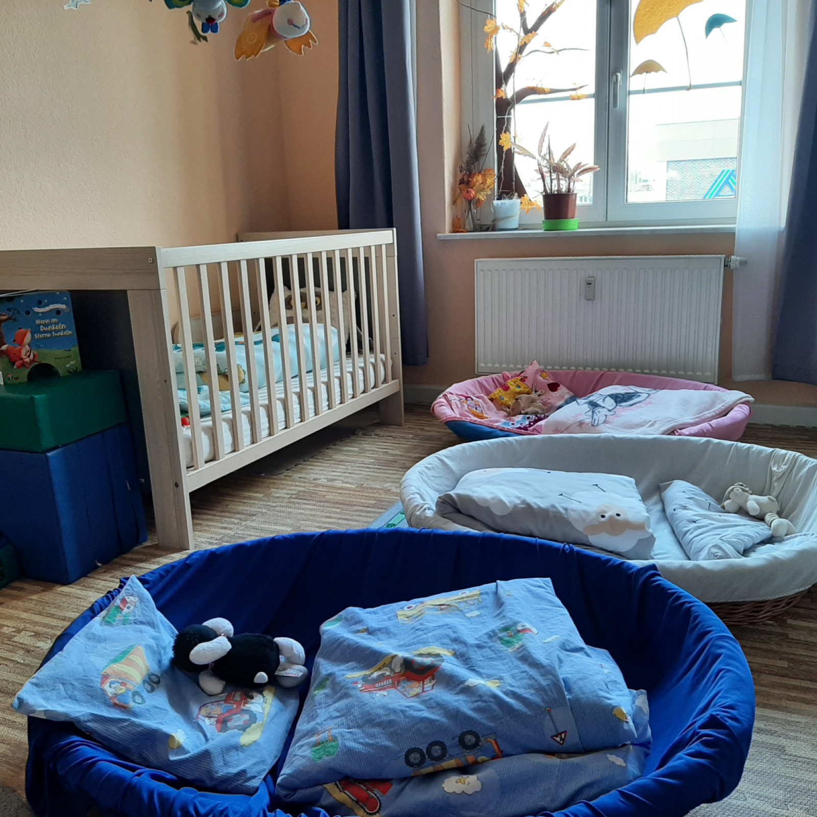 Für den Mittagsschlaf gibt es den Schlafbereich im 2. Gruppenzimmer, mit Schlafkörbchen für jedes Kind, bei Bedarf auch ein Bettchen.